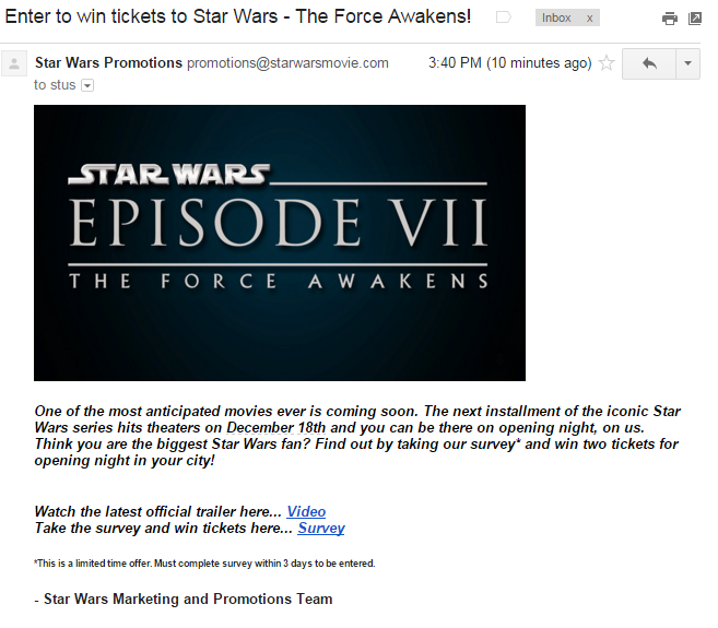 As I have warned you many times, you can never be sure when you get an email or view a posting on social media as to who really sent you the email or posted it on social media. The risk of clicking on links contaminated with viruses and malware is too great. Surveys are often used as a lure by scammers to get people to provide personal information used to make you a victim of identity theft. You should always be wary of online surveys. Tickets to Star Wars are not being offered merely for taking a survey. That kind of offer is typical of many scams that make an offer too good to be true. If you think that such an offer might actually be legitimate, you should confirm it with the real entity that the scammer pretends to be. In this case, the movie is being distributed by Walt Disney Studios so if there really was such a contest or survey, you could find it on the Disney website.